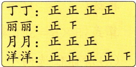 3. 二年级八班进行“小小领读员”评比,老师在黑板上用画“正”字的方法统计了4个领读员的得票。(一个笔画代表一票)