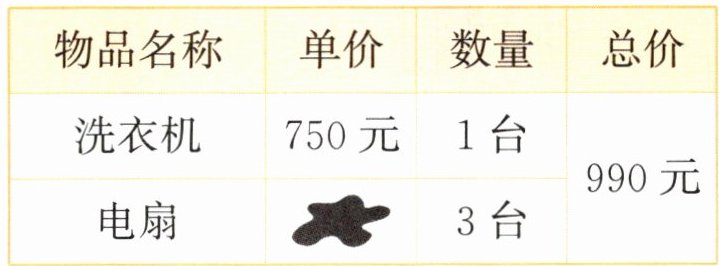 5. (无锡真题)李老师不小心把购物清单弄脏了,请帮李老师算一算,每台电扇多少钱?