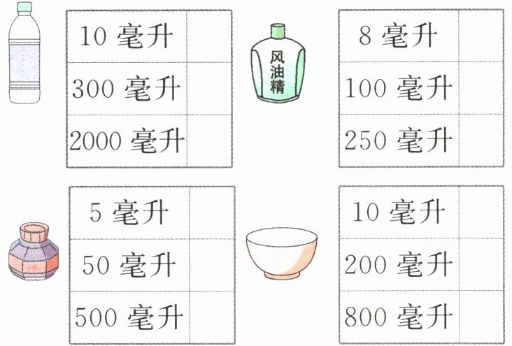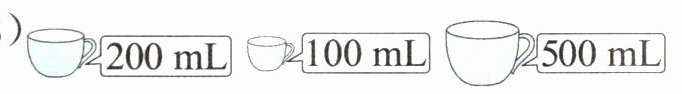 3. (教材母题变式)下面容器的容量各是多少毫升?在合适答案的右面画“√”。