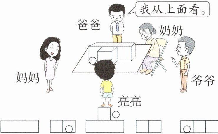 5. 看一看,连一连。桌面上放置了一些物体。爷爷、奶奶、爸爸、妈妈和亮亮所在的位置如图,他们看到的物体的形状是怎样的?连一连。