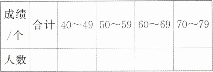|成绩/个|合计|40~49|50~59|60~69|70~79|