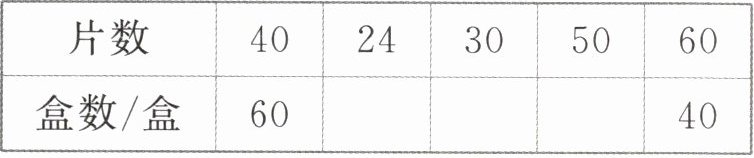 2. 药厂的工人王阿姨分装一种药,若每盒装40片,则可以装60盒;若每盒装60片,则可以装40盒;若每盒装24片呢?30片呢?把下表填完整。