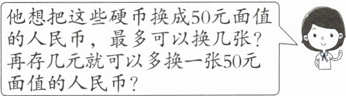 他想把这些硬币换成50元面值的人民币,最多可以换几张?再存几元就可以多换一张50元面值的人民币?