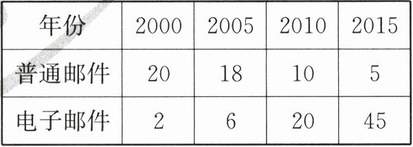 (1)( )年收到的普通邮件最多,( )年收到的电子邮件最多。