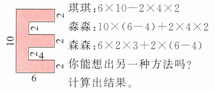 3.(一题多解)琪琪、淼淼、森森看到装潢公司有一个废弃字母材料“E”。他们想计算这个字母材料的面积,于是测量出了数据(如图)。他们三个人的做法,(