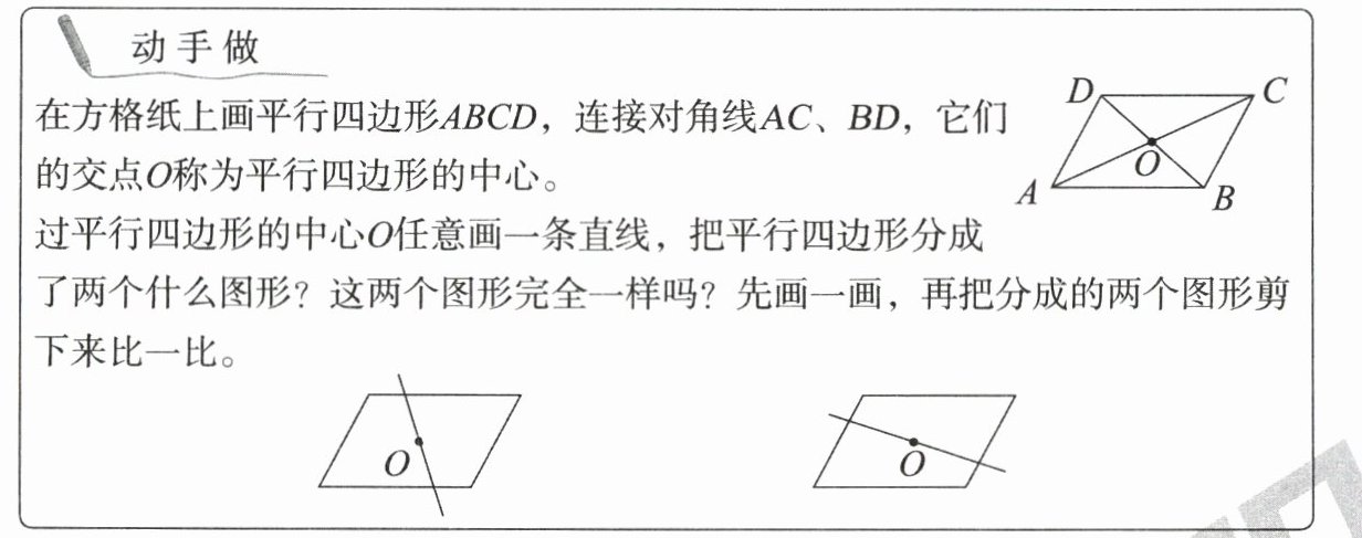 20. 同学们,通过对教材第15页“动手做”的学习,我们已经知道了过平行四边形的中心任意画一条直线,可以将平行四边形分成两个完全一样的图形。(3分)