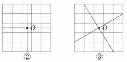 (1)如图①,过正方形的中心O画两条线段,可以将正方形分成4个完全一样的等腰直角三角形。在图②和图③中,过中心O画两条线段,将正方形分成4个完全一样的图形。(用不同方法画一画)