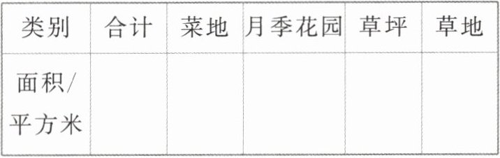 (5)以上第(1)~(4)题中的菜地、月季花园、草坪、草地的占地面积之和是这个学校总的绿地面积,根据前4题中的测量结果,完成下面的统计表。