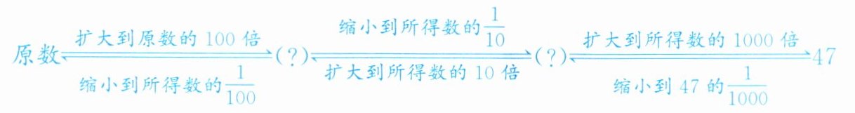 例1 将一个小数先扩大到原数的 100 倍,再将所得的数缩小到它的$\frac {1}{10}$,最后将所得的数扩大到它的 1000 倍后是 47,这个小数是( )。