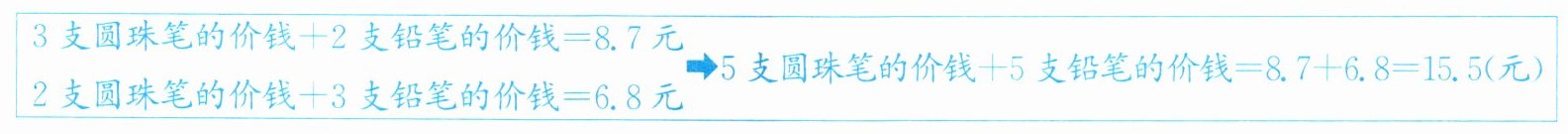 由此可知,1支圆珠笔的价钱+1支铅笔的价钱$=15.5÷5= 3.1$(元),则2支圆珠笔的价钱+2支铅笔的价钱$=3.1×2= 6.2$(元),将这道算式与原题的第一个条件相比,可求出1支圆珠笔的价钱,与第二个条件相比,可求出1支铅笔的价钱。