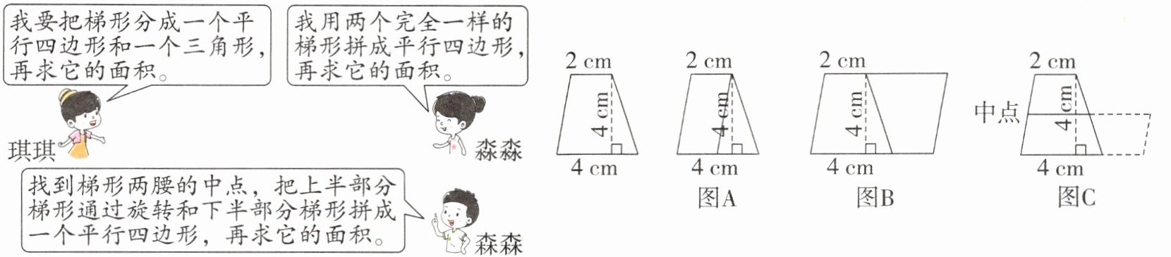 1. (一题多解)下面是琪琪、淼淼和森森三位同学求下图所示的梯形的面积时的对话,请你根据他们的对话,找到相应的图示并用图示的方法计算出梯形的面积。