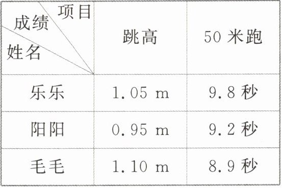 五年级三名同学的跳高和50米跑的成绩记录如下表。