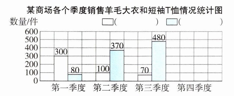 (2)根据第四季度的气温情况,可以估计出销售羊毛大衣的件数比较多,短袖T恤比较少,结合第一季度的情况进一步进行估计即可。画直条时,注意一格表示100件,根据纵轴上的数画出直条并标上数据。