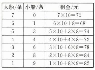 (2)因为租大船更省钱,所以可以从全部租大船开始想起,同时需要注意尽量不要让小船上有空座位。如全租大船,需要7条,租金为7×10= 70(元),但是因为空位比较多,浪费了不少租金,需要继续思考:如大船租6条,可以坐30人,还有2人租1条小船……这样依次想下去。
