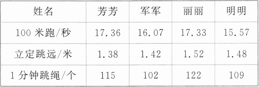 3. (体育健康)芳芳、军军、丽丽、明明在学校三项体育测试中的成绩如下: