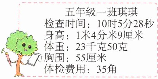 1.(生活体验)"六一"儿童节来临之际,保健院的阿姨们为迎宾学校的学生进行身体检查,五年级一班的琪琪同学体检的部分项目及结果如下: