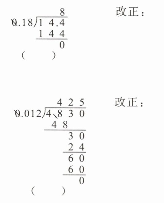 8.(错中求解)奇奇在计算一道除法算式时,把被除数16.2错写成12.6,这样商比原来少72。原来的除数和商各是多少?