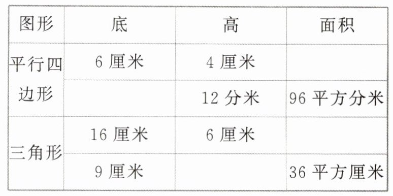 (1)(宁德古田真题)一个三角形和一个平行四边形面积相等,高也相等。如果三角形的底是12厘米,那么平行四边形的底是(