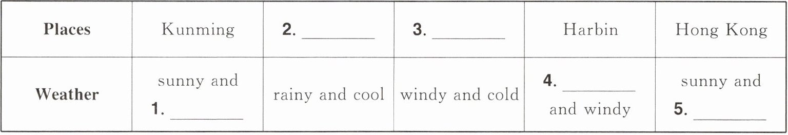 1. hot 2. Shanghai 3. Beijing 4. snowy 5. warm