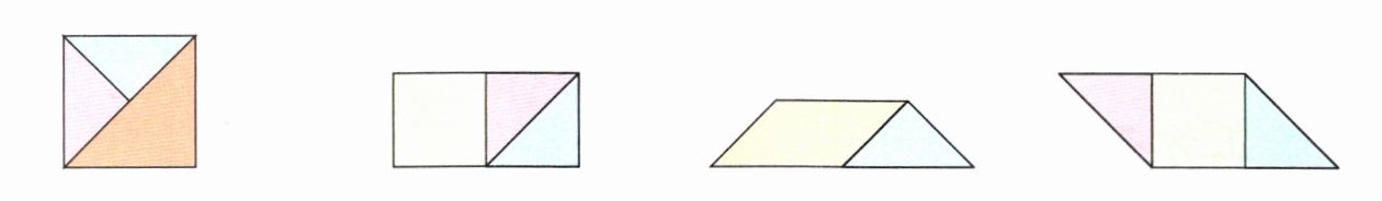 三、新考法 图形探究 下面的图形都是用七巧板拼成的,它们各是什么图形?在下面的括号里填一填。