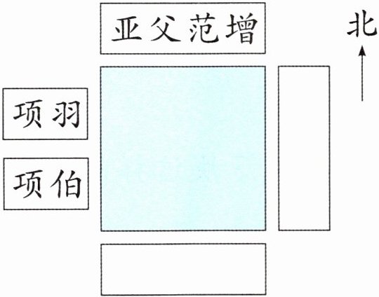 二、跨学科 鸿门宴 鸿门宴是我国著名的历史典故。鸿门宴上,项羽和项伯背西面东而坐,亚父范增背北向南而坐,刘邦背南向北坐,张良则背东向西而侍。你能根据描述把座位补充完整吗?