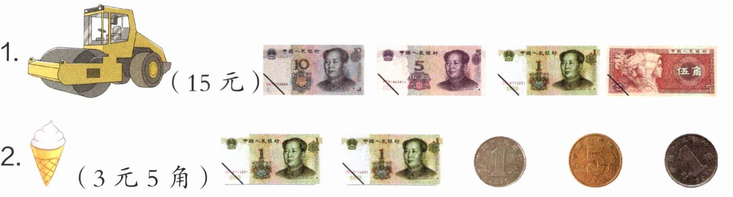 1. 圈10元、5元。2. 圈2张1元纸币,1枚1元硬币和1枚5角硬币