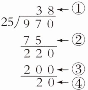 3. 实验班原创 运算能力 安徽歙砚是中国四大名砚之一。刘经理购进950个砚台,平均分发给25个连锁店面。小雨列出了如右下图的竖式,下面说法正确的有( )个。