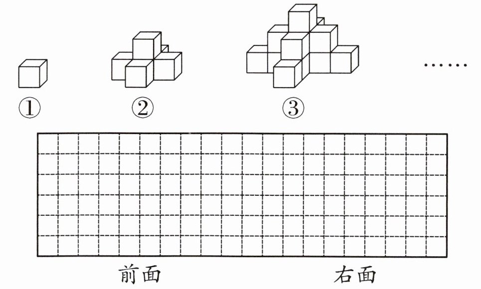 四、实验班原创 空间观念 下图中的物体都是用相同的正方体木块摆成的,按照这样的规律摆下去,请画出第④幅图从前面和右面看到的图形。