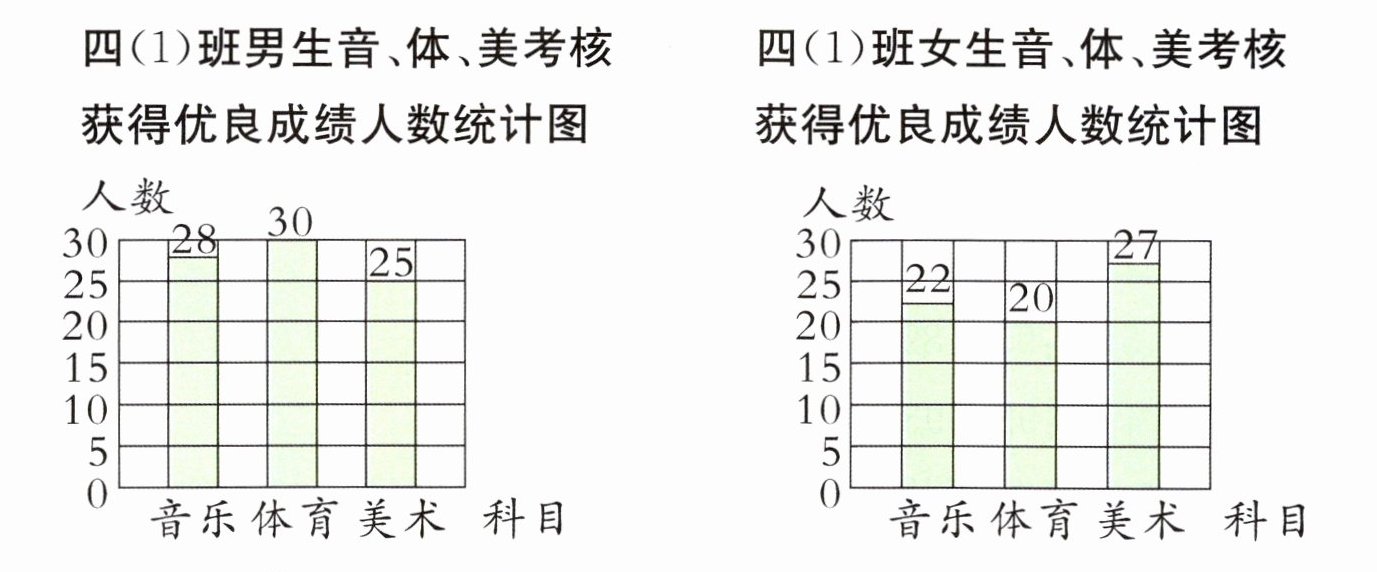 (2)四(1)班体育考核获得优良成绩的人数比美术考核获得优良成绩的人数少(