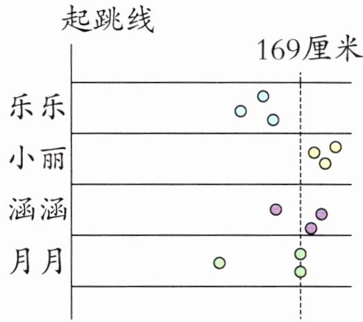 5. 实验班原创 数据意识 右面是四年级4位女生练习立定跳远的3次成绩记录,这四位同学中,3次跳远的平均成绩可能是169厘米的是(