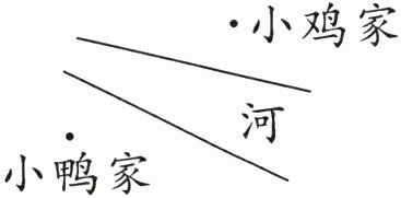 四、小鸭在岸上走路比较吃力,却擅长游泳,它想从家去到小鸡家玩,怎样去比较省力?画一画。