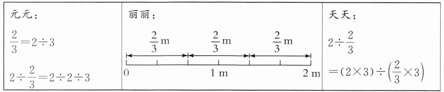 2. 新考法 算理探究 计算$2÷\frac {2}{3}$,三位同学用不同的方法表达了想法,( )的想法合理。
