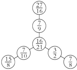 三、把$\frac {3}{2}$、$\frac {7}{8}$、$\frac {7}{9}$、$\frac {7}{10}$、$\frac {15}{8}$、$\frac {27}{16}$、$\frac {16}{21}$分别填入下面的〇里,使每条线上3个数的积都是1。