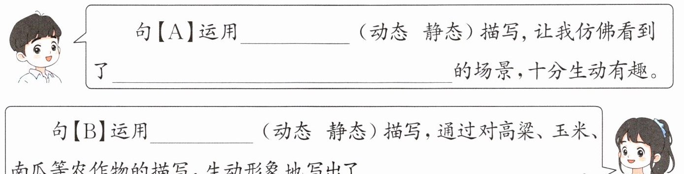 句【A】运用____(动态 静态)描写,让我仿佛看到了____的场景,十分生动有趣。
