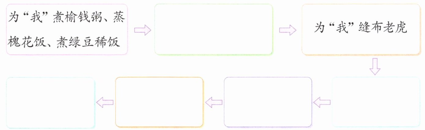 为“我”煮榆钱粥、蒸槐花饭、煮绿豆稀饭→→为“我”缝布老虎→→→→