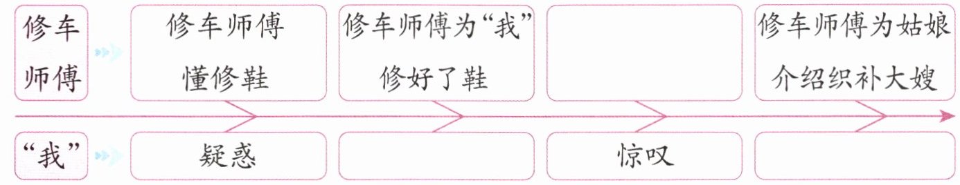 1 整合信息 请梳理修车师傅的相关情节及“我”的情感变化,补全思维导图。(3分)