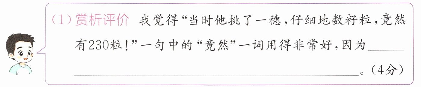 (1)“竟然”表示出乎意料,强调了这株稻株籽粒之多,也体现出袁隆平发现它时的惊喜与意外,侧面反映出这一发现对后续研究的重要意义