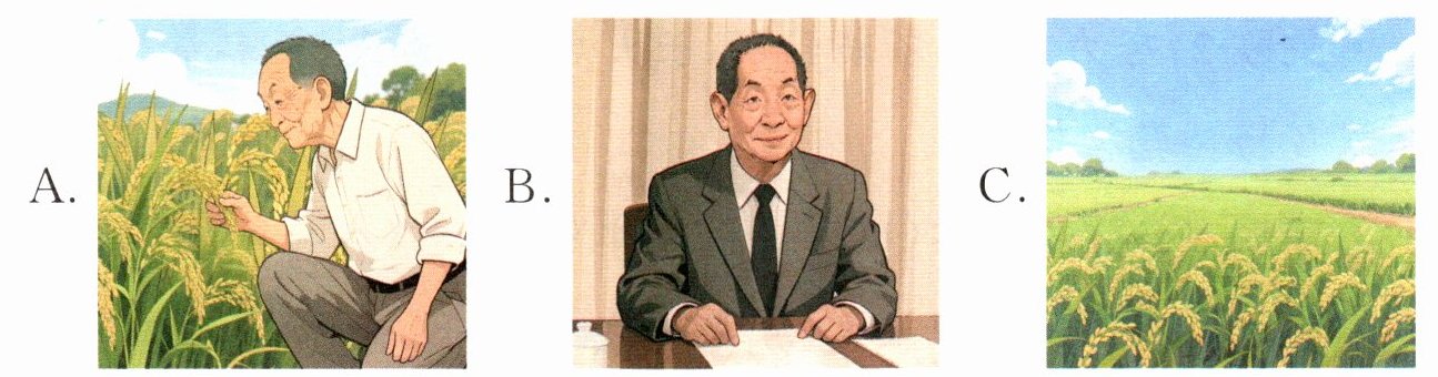 (3)A 这张图片呈现了袁隆平爷爷深入田间潜心研究杂交水稻的情景,体现了袁隆平爷爷脚踏实地、执着奉献的科研精神