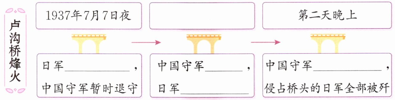 ⑦卢沟桥事变拉开了中华民族全面抗战的序幕。从此,大江南北,长城内外,中华儿女冒着敌人的炮火共赴国难,在神州大地上奏响了一曲抗击日本侵略的英雄凯歌。