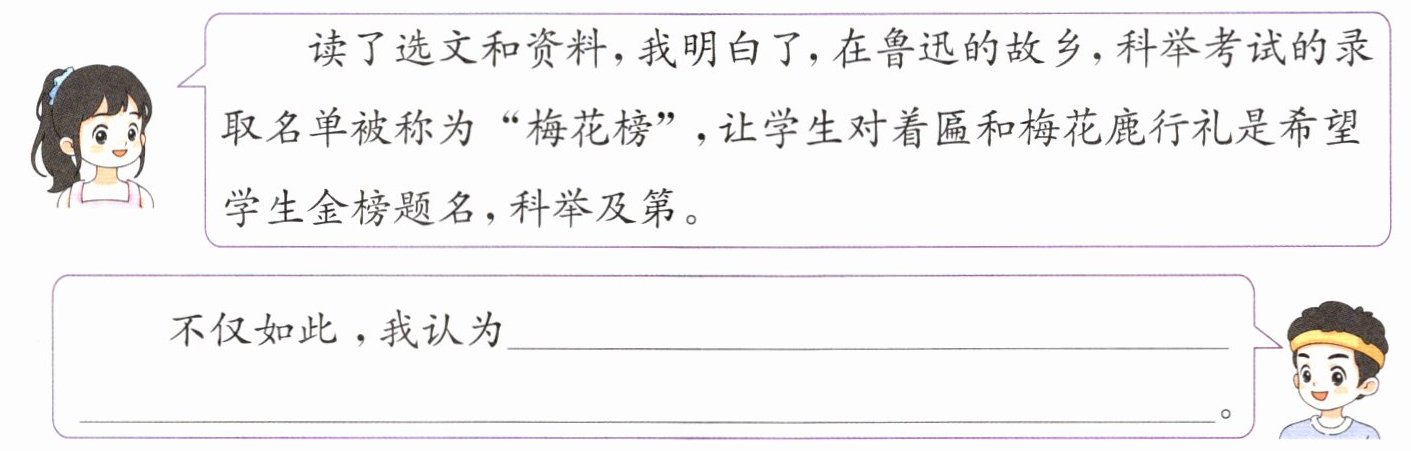 读了选文和资料,我明白了,在鲁迅的故乡,科举考试的录取名单被称为“梅花榜”,让学生对着匾和梅花鹿行礼是希望学生金榜题名,科举及第。