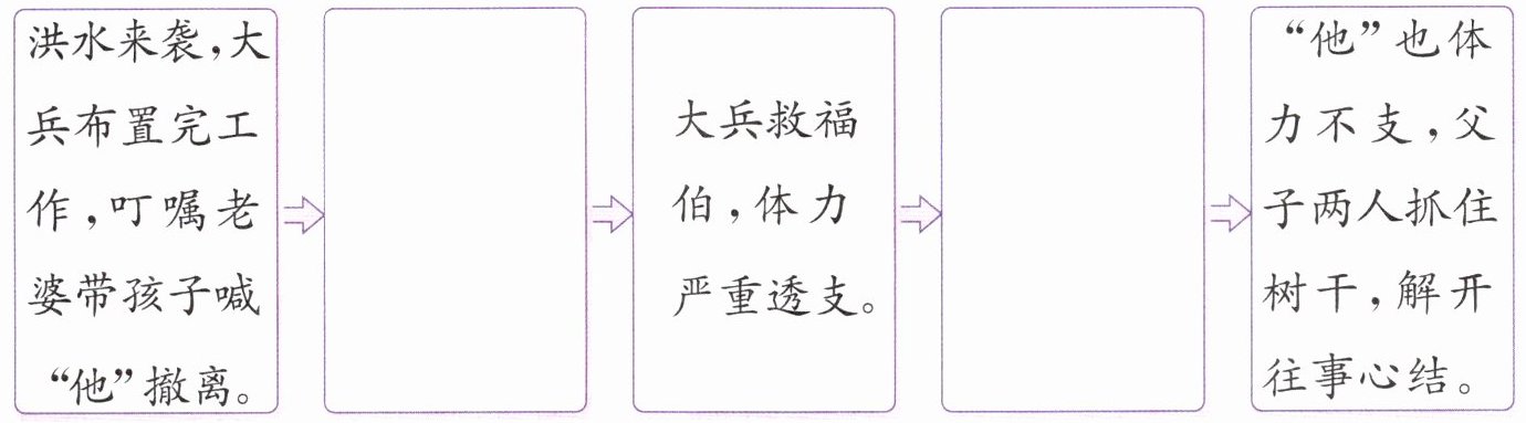 ⑤晌午时分,大兵将10多户村民撤到了安全地带,有人说福伯还没撤出来。大兵的心一下子揪紧了,辨辨方向,赶忙朝福伯家赶去。