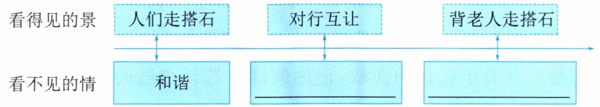 1.B A 走搭石要走得快些,过桥应该走得慢些 2.形容水面上人影交叠、动态连绵的视觉美感 3.B C A 4.礼让 尊老