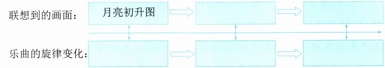 1. 他好像面对着大海,月亮正从水天相接的地方升起来。微波粼粼的海面上,霎时间洒满了银光。月亮越升越高,穿过一缕一缕轻纱似的微云。忽然,海面上刮起了大风,卷起了巨浪。被月光照得雪亮的浪花,一个连一个朝着岸边涌过来……(联想到的画面)月亮穿云图 波涛汹涌图 (乐曲的旋律变化)舒缓 渐强 激昂 2. 神态描写。生动形象地写出了盲姑娘听音乐时的专注和陶醉,表现出她对音乐的热爱。 3. 因为贝多芬的音乐极具感染力,生动描绘出月光下大海的景象,而盲姑娘热爱音乐且有一定音乐素养,虽然无法用眼睛去看,但她能根据音乐在脑海中构想画面,所以说她仿佛看到了她从来没有看到过的景象。 4. 示例:听到国歌时,我仿佛看到无数革命先烈为祖国的独立和尊严,在战场上浴血奋战;仿佛看到五星红旗在天安门广场上冉冉升起,全国人民欢呼雀跃;仿佛看到运动健儿们在赛场上奋力拼搏,为祖国赢得荣誉。