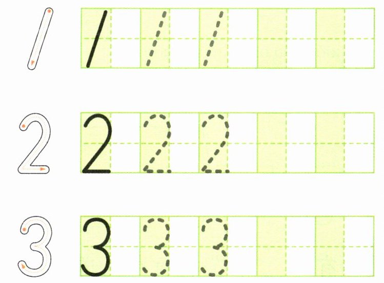 按照图中数字“$1$”“$2$”“$3$”的书写示范,在对应的田字格中,用同样的书写规范和笔画顺序,将数字完整、规范地描写出来即可