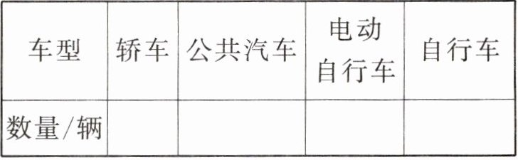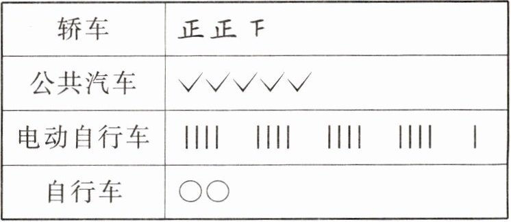 (4)电动自行车 解析:本题考查数据的整理、统计和分析,不论用什么符号表示数据,统计时都要注意符号和数量的对应,细心数,不重复、不遗漏。