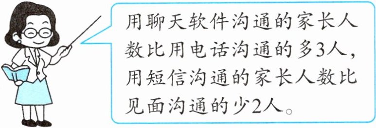 5. 刘老师用画“正”字的方法统计了一星期里用不同方式跟老师沟通孩子学习情况的家长人数,但她忘了标注名称了。你能根据提示填写统计表吗?