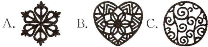 (4)【原创题】剪纸艺术是中华民族的传统民间工艺,它源远流长,经久不衰,是中国民间艺术中的瑰宝。下列剪纸中,不属于轴对称图形的是( )。