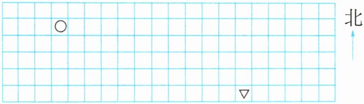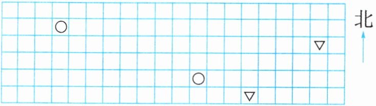 【点拨】根据"上北、下南、左西、右东"将▽向上平移3格,再向右平移4格,找到现在的位置画出图形;第(2)小题与第(1)小题不同,是要找出原来的位置,所以要用还原问题的思路,即向南平移3格,再向东平移8格才是原来的位置,画出○即可。