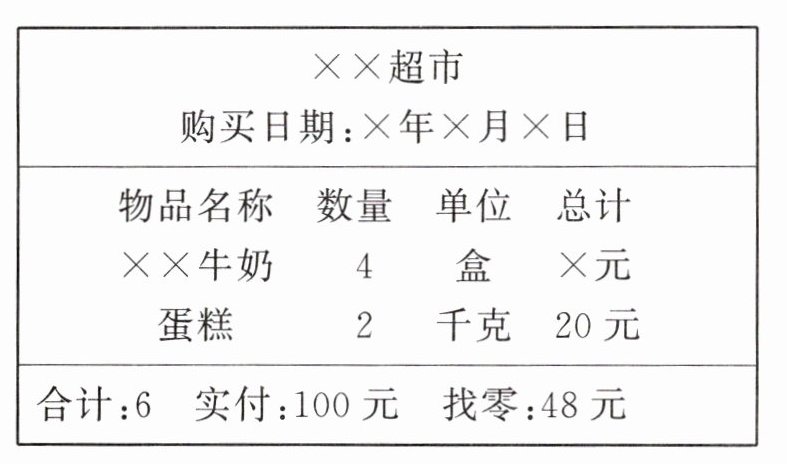 5. 【生活经济】下面是一张超市的结账单,请你根据单据的金额算一算,每盒牛奶多少钱?