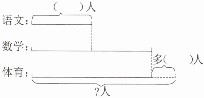 4. 【原创题】实验小学三年级举办了校园定向越野闯关活动,共设置了语文、数学和体育三个关卡。活动结束后,李老师调查了同学们对这三个关卡的喜欢情况,喜欢语文的人数为 95 人,喜欢数学的人数是语文的 2 倍,喜欢体育的人数比数学多 30 人,喜欢体育的有多少人?(先把示意图补充完整,再列式计算)